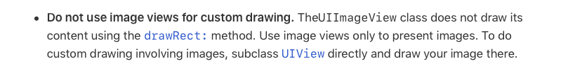 drawRect UIImageView不用重写drawRecct去自定义重绘内容,写了也没用,替代方法可以参考用UIView作为UIImageView的子类,然后对UIView进行drawRect